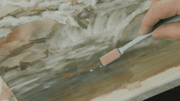 Johannes uses PanPastels to achieve atmospheric effects in his watercolor painting by applying light layers on top of the dry painting. As the painting nears completion, the powdered pigment is applied using a soft applicator. In the example below, Johannes uses light pressure on the textured watercolor paper to achieve a drybrush effect.