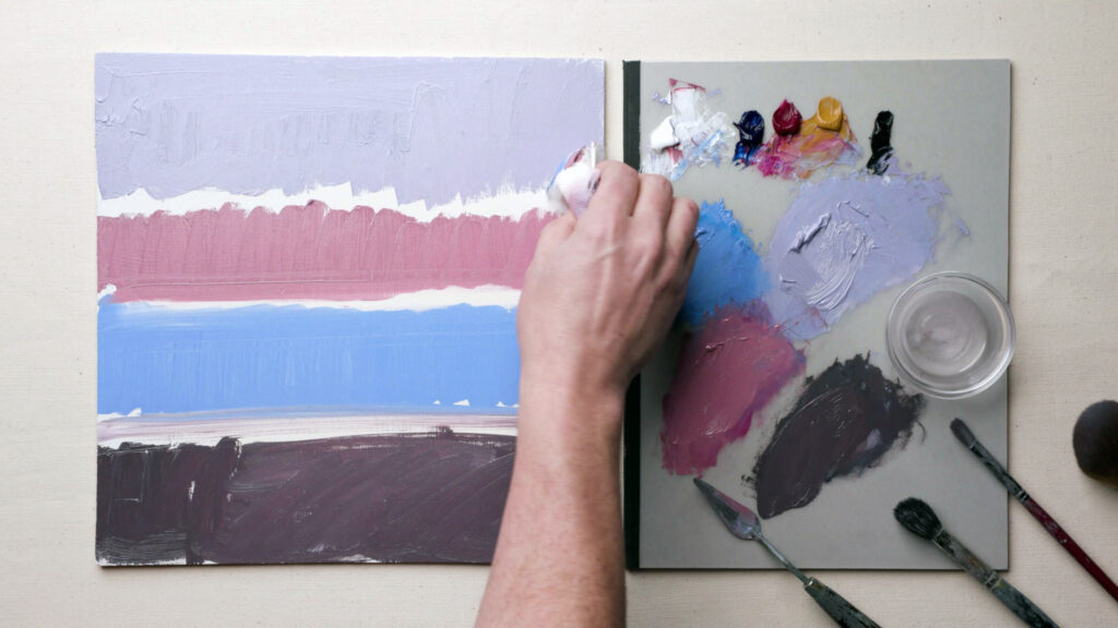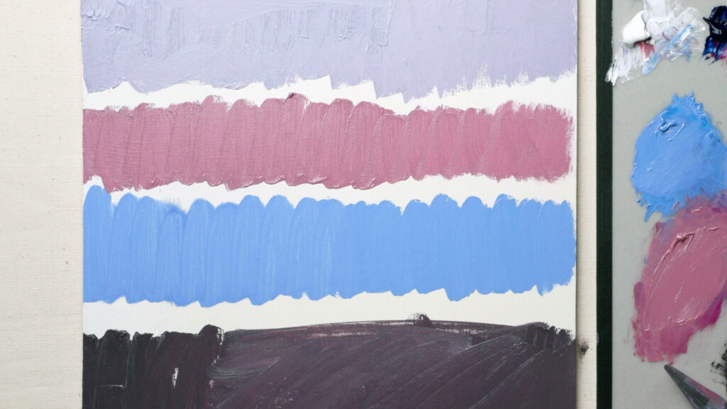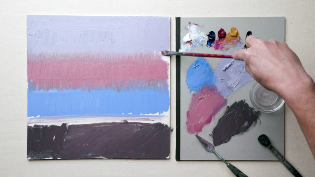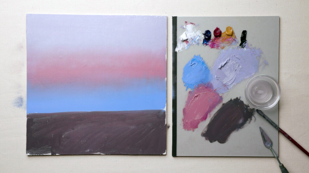 In this simple study, we practice blending in oils. For any oil painter, knowing how to blend your paints is essential for controlling edges and turning forms. Practice your blending technique by following along with this 5-step tutorial, creating a sky gradient with 4 basic colors. I’ve pre-mixed these colors so that we have a quick, deliberate study to avoid fussing over the process.