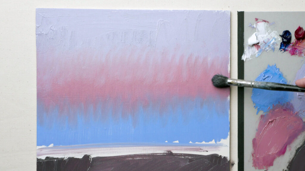 With the filbert brush, use short, vertical marks to bridge the gap between the colors in the sky area. I’ve wiped the brush dry before this step and take several passes, adjusting the length and angle of the marks to smooth the transition.