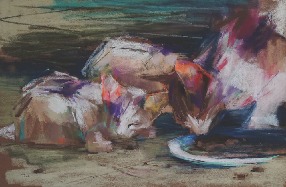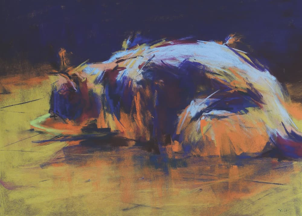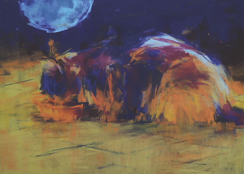 After: After taking some time to figure it out, I was ready to rebuild the form and shape of the cat. I also transformed the food plate into a bowl. Finally, I added the moon in the background to complete Under the Moon (pastel, 18×25).