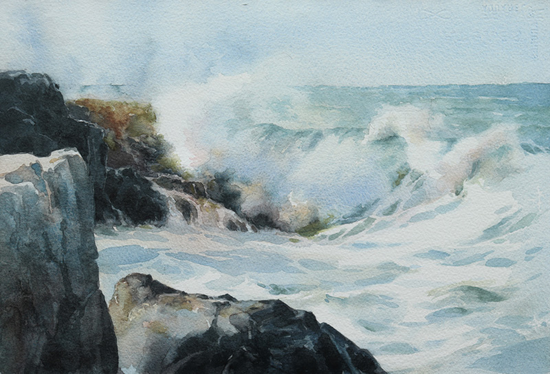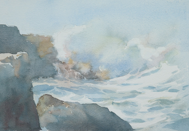 Final Step: I decided I didn’t like the straightness of the sienna-colored top edge of the back rock. Using a Rosemary and Co Eradicator brush, I lifted the color and proceeded to repaint the edge, making it a more interesting shape. I added my final darks and a few fine lines in the rocks to complete Wave Patterns (watercolor, 10½x14).