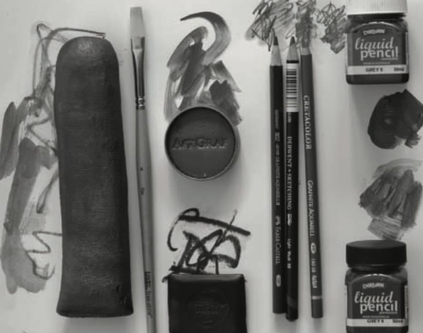 Water soluble graphite is available in degrees ranging from HB to 8B. It is sold in pencils, as well as in stick, pan, and liquid form. The pencils work beautifully with or without water. When dry, they feel velvety smooth as they glide over paper. They make deep rich darks, and they are erasable like normal pencils. But add a drop of water and the graphite turns inky black and can be applied and manipulated with a brush.