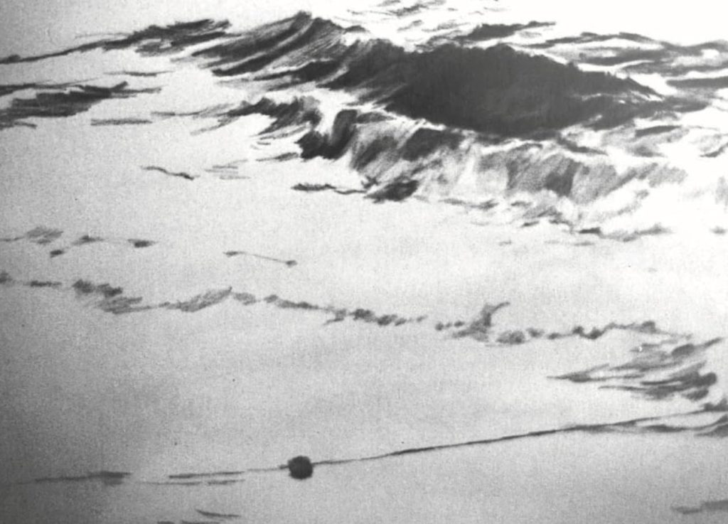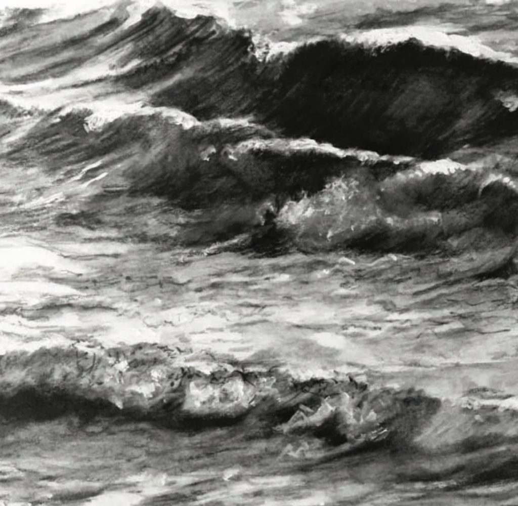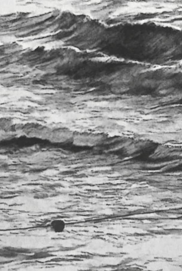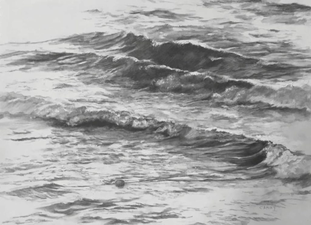 I began this drawing using a dry 4B water soluble pencil from Faber-Castell, working on a medium-texture illustration board. I first placed the large cresting wave — the image’s most important compositional element — in the upper-right corner. I pressed hard enough on the dry pencil to assure that the wave would be the darkest aspect of the drawing. I drew the small buoy almost as dark and clearly indicated its line, which I wanted to act as a counterbalance to the diagonal movement of the water.
