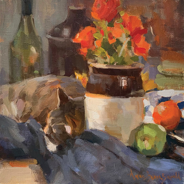 Anne Blair Brown’s paintings evoke the quiet moments when, for a brief spell, the world pauses its hustle and bustle. A cat snoozing by a crock of flowers, cows in a field with an old shed, sun-drenched Adirondack chairs flanking a small table—each scene is depicted with loose, painterly strokes and restful color harmony. Fittingly, Brown describes herself as a contemporary impressionist. “My work is a modern version of impressionist painting,” she says. “My goal is to give less information with more impact, as was the case for French and Russian Impressionists.”