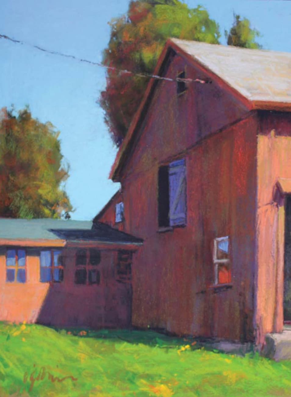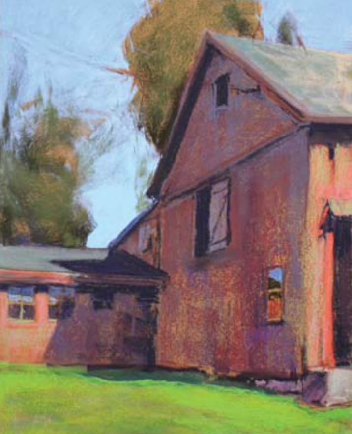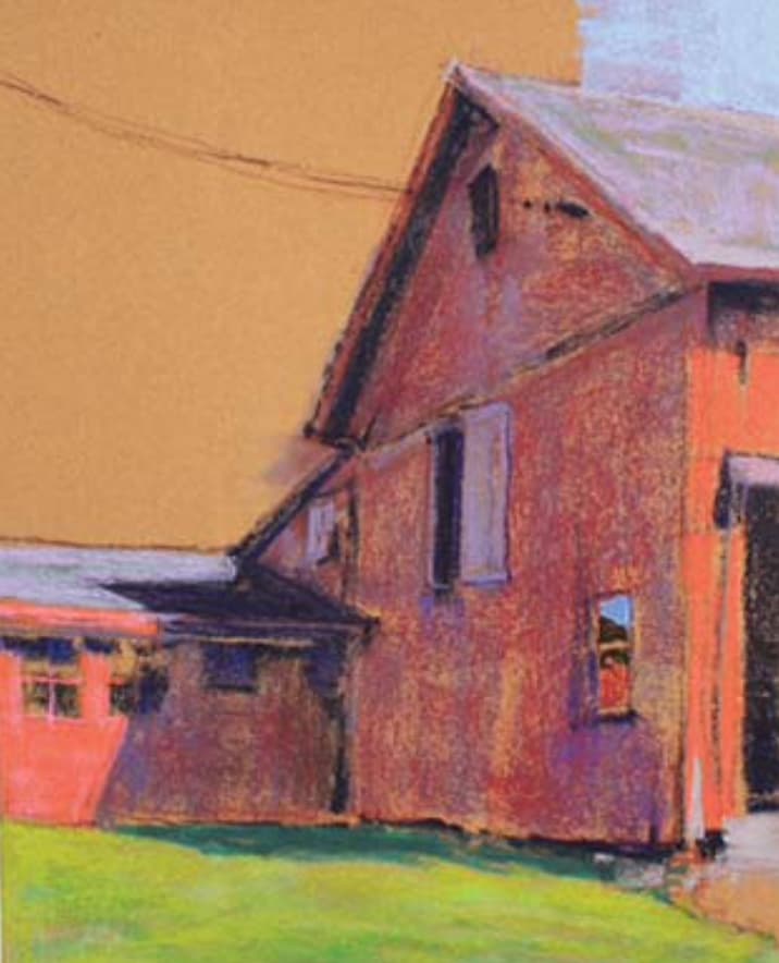 I used multiple layers of pastel that were of the same value but different color temperatures; this implies the texture of weathered wood. I left the color broken on the surface; this allows a viewer’s eye to see the different layered colors as an interesting neutral — there, but not dominant. I then used more saturated hues both in the foreground and in the barn window.
