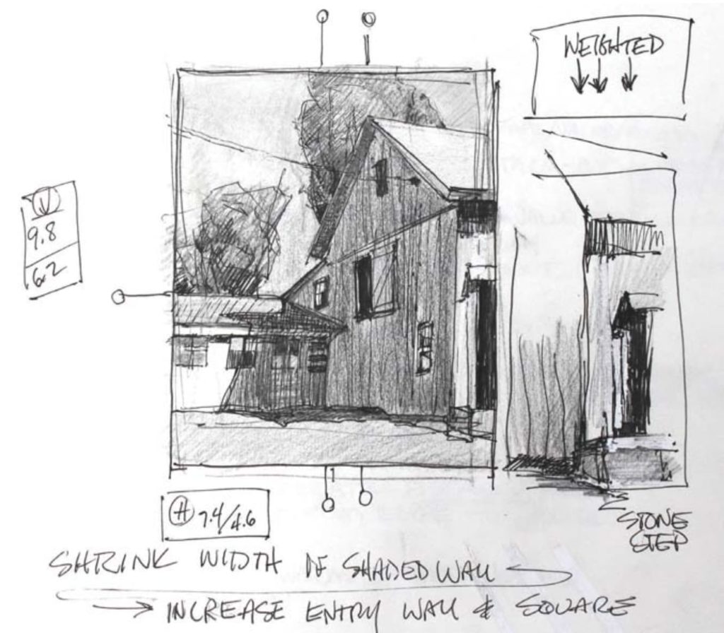 I further developed the landscape scene, adding trees behind the barn that contribute to the balance of shapes.