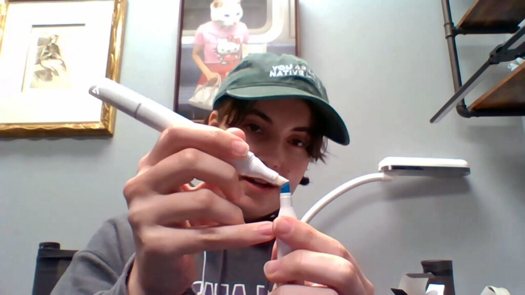 Among all the color options available, you’ll find a “colorless blender,” a marker containing just the alcohol medium and no colorant. This blender can help soften marks by diluting the colorants of other markers, but it’s challenging to work with on existing marks. In most other media like charcoal, graphite or oil, blending comes after the marks have been laid down. What Mot demonstrated is a cool trick in which much of the work happens before you even put the marker to paper! By loading up the marker tip with pure alcohol ink, it’s temporarily diluted, allowing for marks that are initially light but that gradually darken as marks are made. Fascinating!