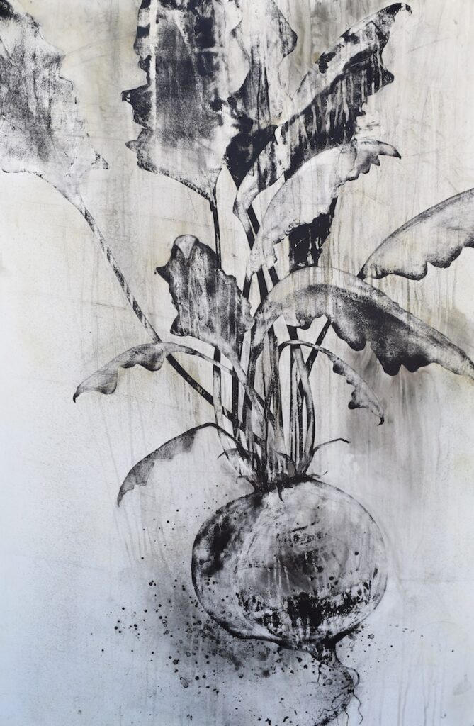 Once a drawing has dried, the artist uses sandpaper to blend the ink into the Mylar and to distress the ink, creating what she calls a “halo effect” around the shape of the plant. Jung also starts applying charcoal at this stage, defining the form of the plant at a deeper level. Grattage—the removal or erasure of granulations—is another technique that comes into play, involving various tools or the use of water. The artist points out that her movements around the ink must be calculated, especially when they involve water, as it has an aggressive power to strip away pieces of the composition—but when the sweet spot is achieved, a finished work by Heidi Jung hangs in captivating repose. Presented in panel form, the raw organic image draws in the viewer through its sheer familiarity. Something as simple as a common beet presents an alluring design.