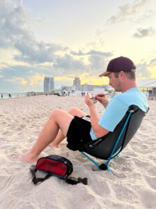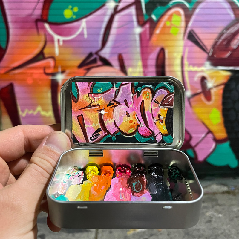 Robinson painted his first mint-tin painting in 2017. Over the years, he has perfected a compact painting kit that fits inside a fanny pack. In it, you’ll find a zippered pencil case with elastic holders for brushes and a few sheets of thick Viva-brand paper towels. He also brings a mint container with a wood panel already affixed into the lid with squares of thin Velcro.