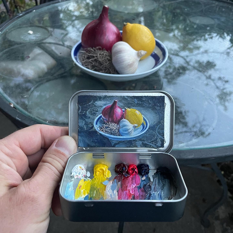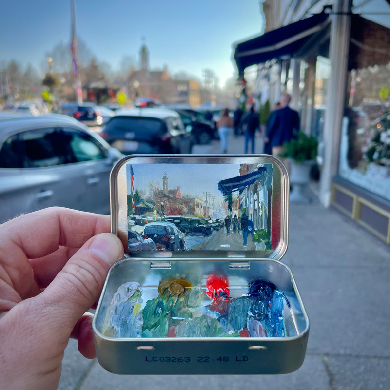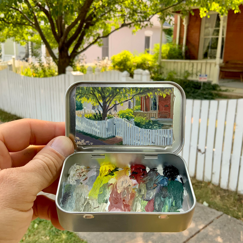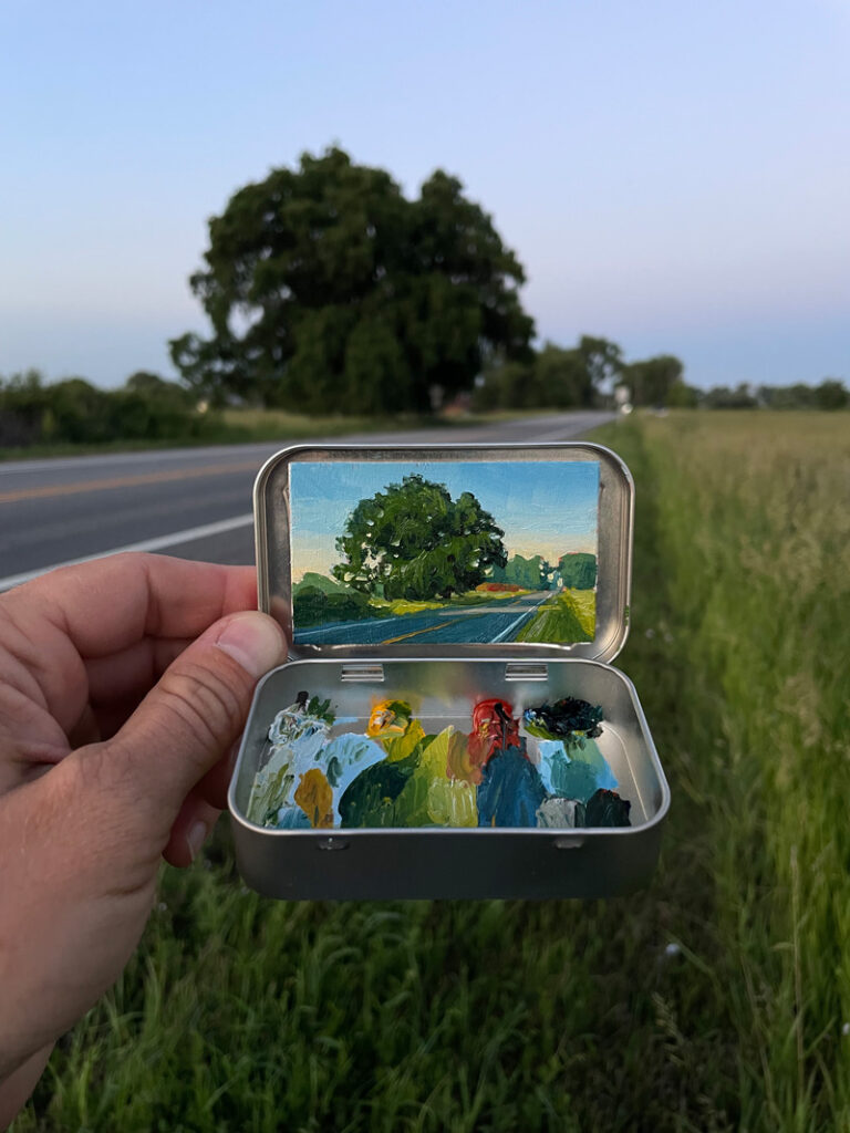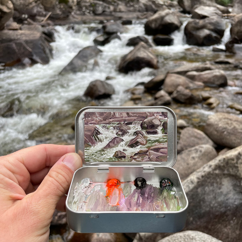 Robinson stresses that he didn’t invent the idea of using a mint box as a tiny en plein air painting kit. He gave it a try after meeting Heidi Annalise, another Colorado artist who was already doing it. Not wanting to copy her idea, he asked if she’d mind if he tried it. She said sure—she didn’t own the concept. In fact, she’d picked up the idea from yet another artist.