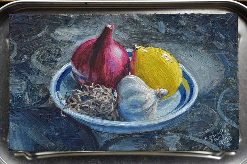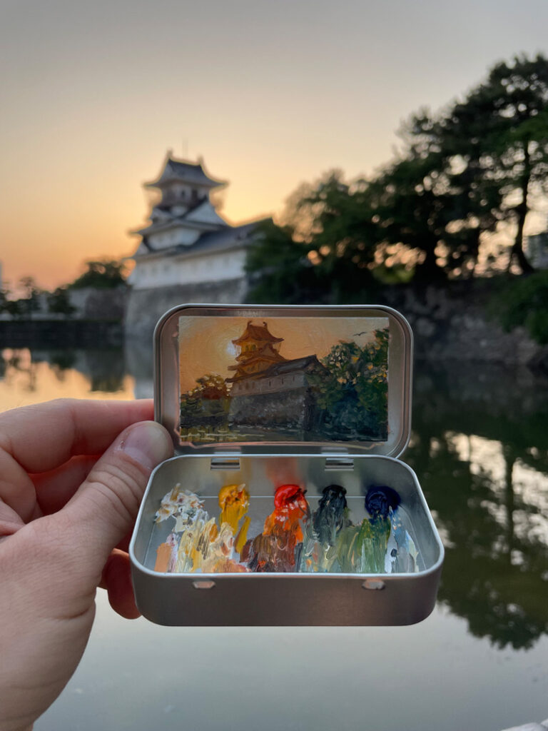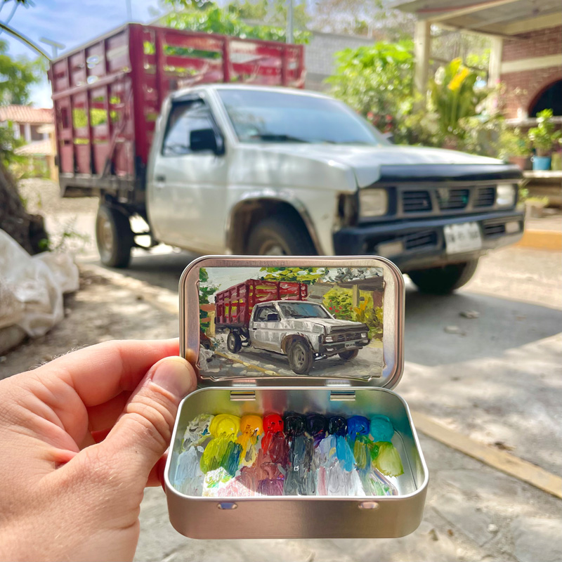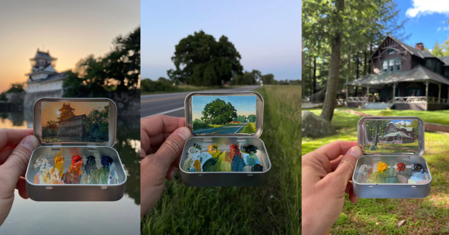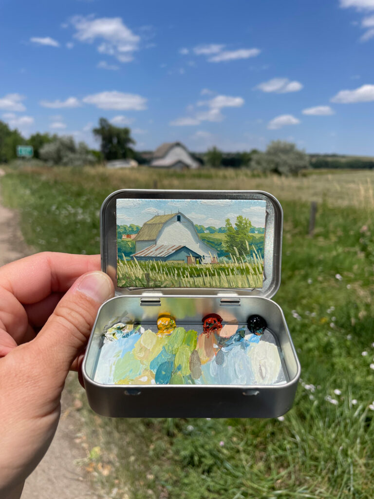 Robinson stresses that he didn’t invent the idea of using a mint box as a tiny en plein air painting kit. He gave it a try after meeting Heidi Annalise, another Colorado artist who was already doing it. Not wanting to copy her idea, he asked if she’d mind if he tried it. She said sure—she didn’t own the concept. In fact, she’d picked up the idea from yet another artist.