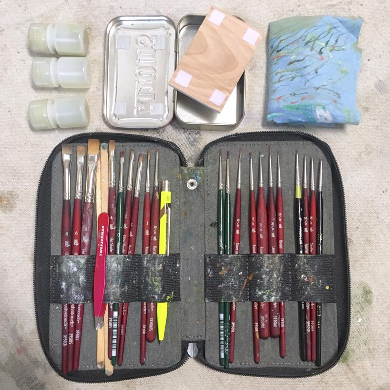 For paint, he’ll bring a tube of white and a few colors. “If you’re trying to be minimal, you don’t even need to bring the tubes with you as long as your palette has been in the tin two days in advance so it doesn’t slide around,” says Robinson. He uses oils most often but occasionally uses Golden Open slow-drying acrylics. “They dry faster than oil but still slow enough to be able to blend,” he says.