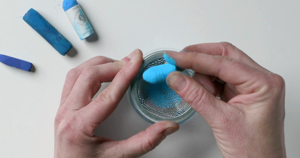 “Everybody talked about using sandpaper to shape their pastels and how much valuable pigment that wastes,” said Heather. “And then one guy said he used wire mesh, and I thought, ‘Well if you’re using wire mesh, couldn’t you collect the pigment?’”