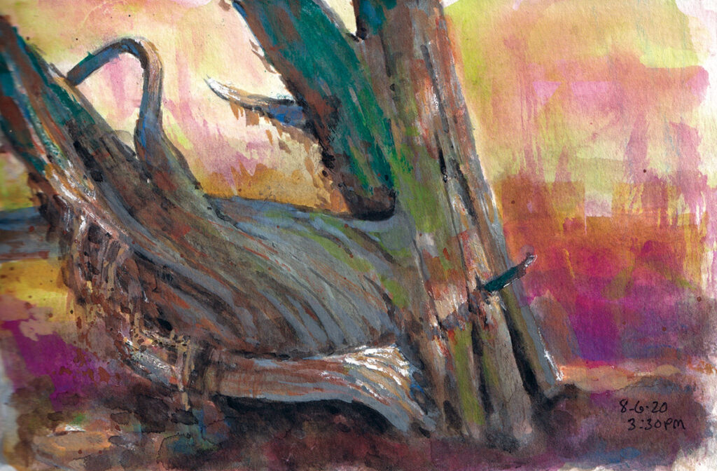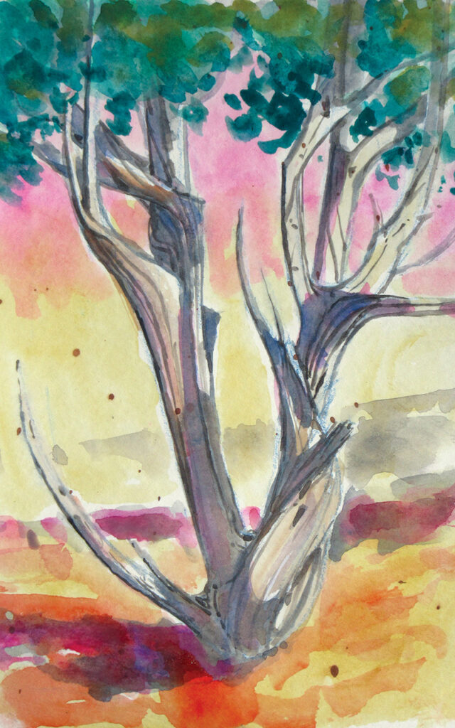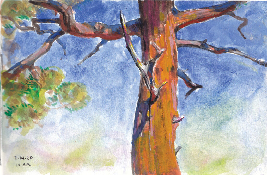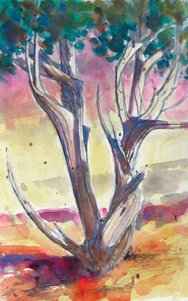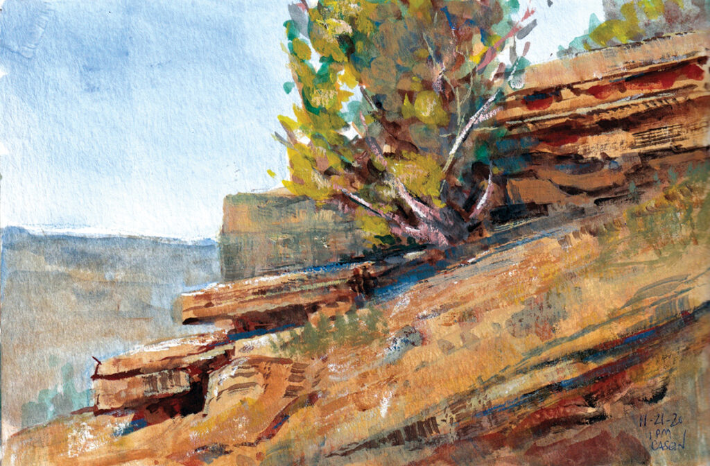 In the final stage of Canyon Juniper (gouache, 8×5), I added texture to the bark, being careful to keep the brush fairly dry. Juniper bark can be quite light where sunlight hits it, so I used fully opaque white to add a few highlights. On the other hand, junipers often have shreds of warm, dark bark, especially in the shadows. To convey the feeling of that shredded bark, I filled my brush with opaque brown gouache and tapped it gently for a spatter pattern.