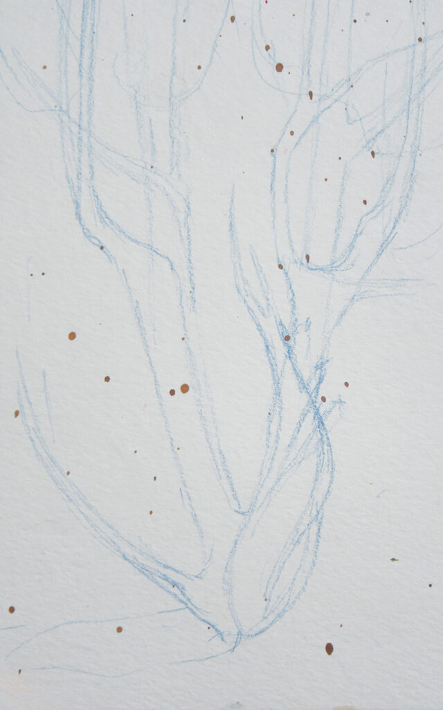 In my sketchbook, I first lightly drew the shape of the juniper with watercolor pencil. I chose a blue pencil because it would add a nice temperature contrast to the warm colors I planned to use when painting. The brown speckles are from an overly aggressive treatment of a sketch on the opposite page. I didn’t mind them because I knew they’d add interest to the final sketch.