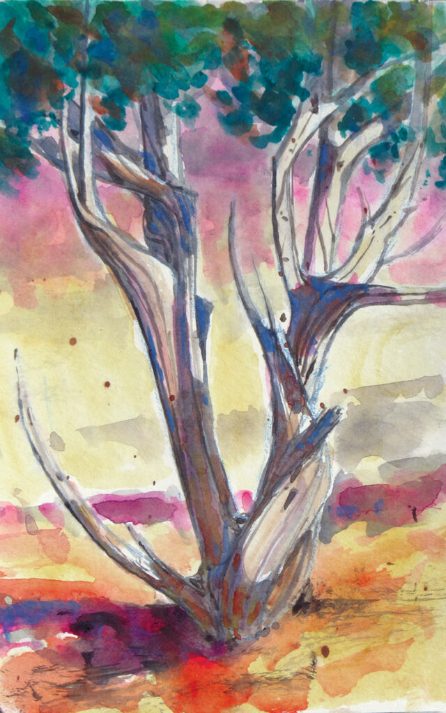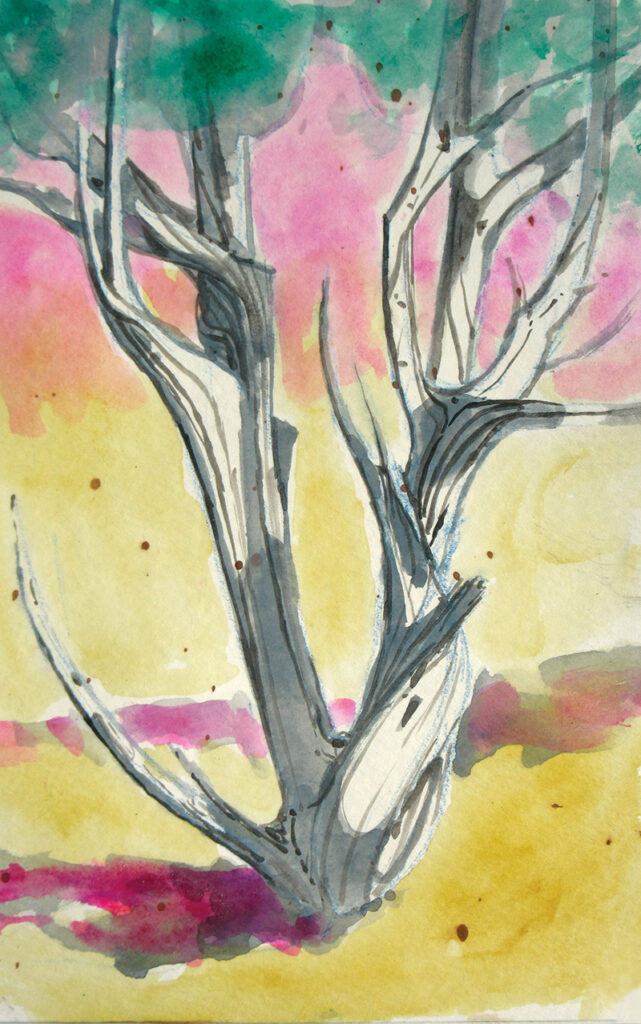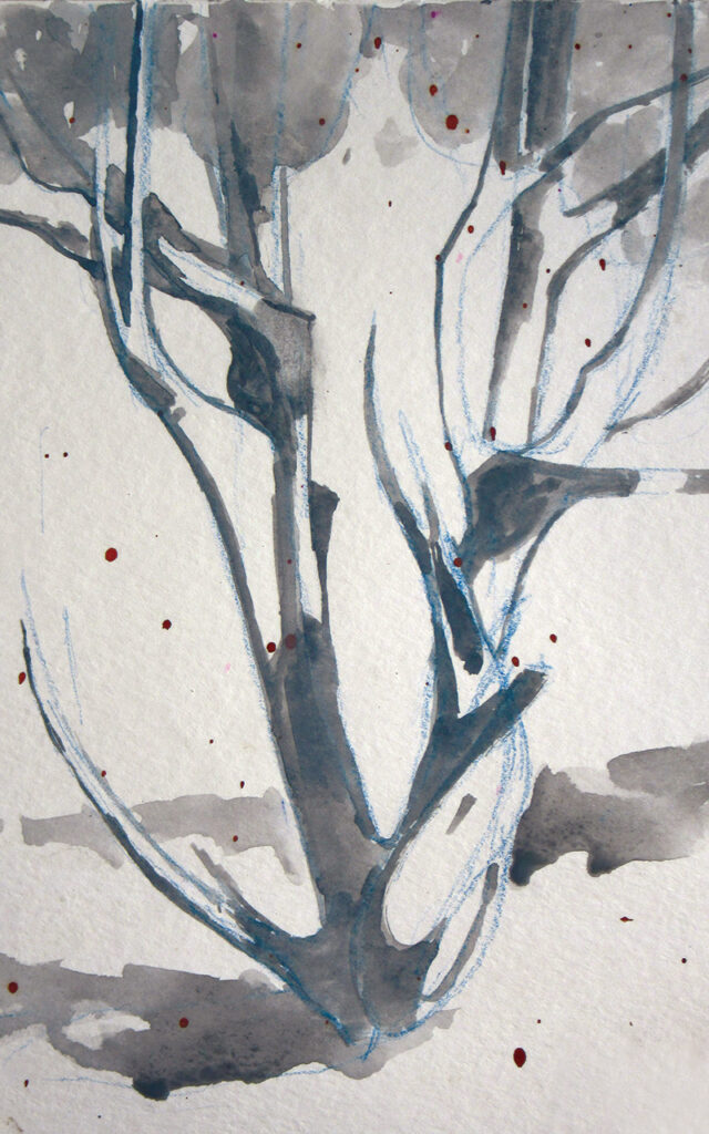 I started applying transparent color, thinning the gouache enough so it acted more like watercolor. I used a darker, thicker wash mixture of black and brown to draw the lines denoting form in the tree.