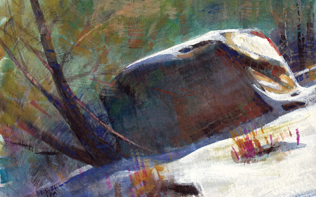 You may ask, Why gouache and not watercolor? I could use watercolor for these sketches, but the opacity of gouache is more suitable for my painting approach. As an oil and pastel artist, I’ve always been a fan of broken color and scumbling—two techniques I find more amenable to opaque gouache than to transparent watercolor. Gouache’s opacity also allows me to correct mistakes and eliminates the need to save the lights. Instead, I can punch in highlights toward the end. As the need arises, I can also use gouache transparently; when thinned enough, it produces stained-glass-like effects, similar to those of watercolor.