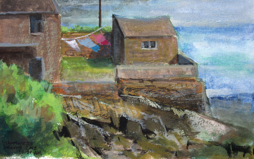 I scrub a lot when I paint, but the 140-lb. cold-pressed paper in the Pentalic sketchbook is durable and can take a beating. It buckles only slightly, even with a heavy wash. The pages are sewn into signatures and lie flat, so if I want to use two pages for a wider, 5×16 sketch, I can do so. Sometimes, when the weather is cool and damp—as in Scotland—and my sketch hasn’t quite dried, I’ll lay a paper towel over it and close the book, protecting both the new painting and the older painting on the opposite page. An elastic band on the journal not only keeps it closed with the paper towel in place but also prevents damage to the pages when I cram the journal into my pack.